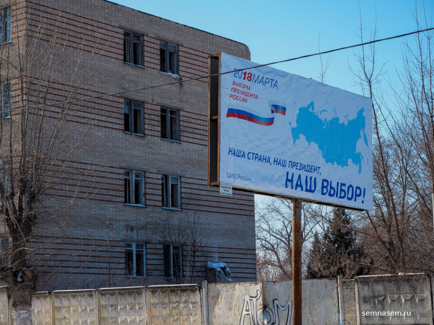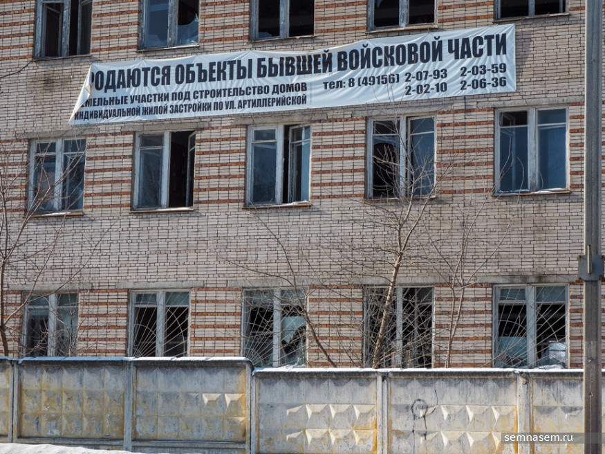 Перед четырехэтажным зданием казармы с разбитыми окнами установлен баннер с надписью: «2018 марта — выборы президента России. Наша страна, наш президент, наш выбор». Цифра 18 выделена красным цветом. На фасаде здания — растяжка с объявлением: «Продаются объекты бывшей войсковой части, земельные участки под строительство домов индивидуальной жилой застройки по ул. Артиллерийской». И номера телефонов — как выяснилось, комитета муниципальной собственности Скопина.