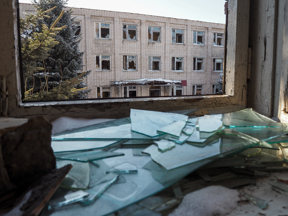 Остальные помещения такие же, как и другие: выломанные рамы, разбитые стекла, обломки мебели. Учебные брошюры и журналы, небольшие макеты домов, расписание занятий. Учебная доска с ячейкой для мела. В одной стороне — куча кирпича, в другой — целый кирпич, сложенный аккуратной стопкой, готовый к вывозу.