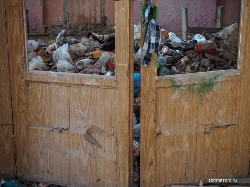 При входе слева — вахта, на которой стоит пустая бутылка из-под пива. Тут же, на стене незаконченная надпись: «Спаси и сох».