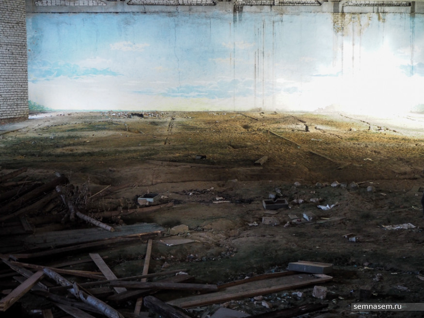 Внезапно среди разрухи перед нами открылась светящаяся панорама: зеленое поле и голубое небо в облаках. Небо нарисовано на задней стене помещения, поле — это макет местности, иллюзию свечения создавали лучи солнца, которые падали из окон справа и слева прямо на «небо». Проход к панораме завален досками.