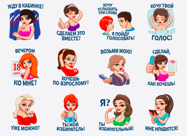 24 февраля сообщество «Только для взрослых» выпустило собственные стикеры «Election Girl» с девушками, которые призывают идти на выборы. Сообщество создал журнал Maxim. Главный редактор издания Александр Маленков назвал его «партнерским проектом, заключённым на специальных условиях», но партнеров и заказчиков не раскрыл.