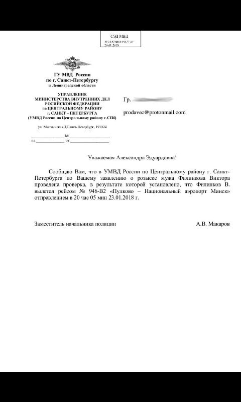 МВД сообщило жене арестованного по «пензенскому делу» в Петербурге антифашиста Виктора Филинкова, что он вылетел в Минск. Ответ ведомства она опубликовала в фейсбуке, однако вскоре пост был удален.