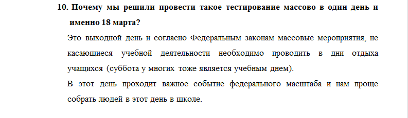 Представитель регионального министерства не смогла объяснить, почему именно в этот день оно будет бесплатное и кто его оплатит. При этом в другой день у школьников вообще не будет возможности пройти данный тест. Выбор воскресенья чиновники объяснили федеральным законодательством, по которому проводить такие мероприятия можно лишь во внешкольное время.
