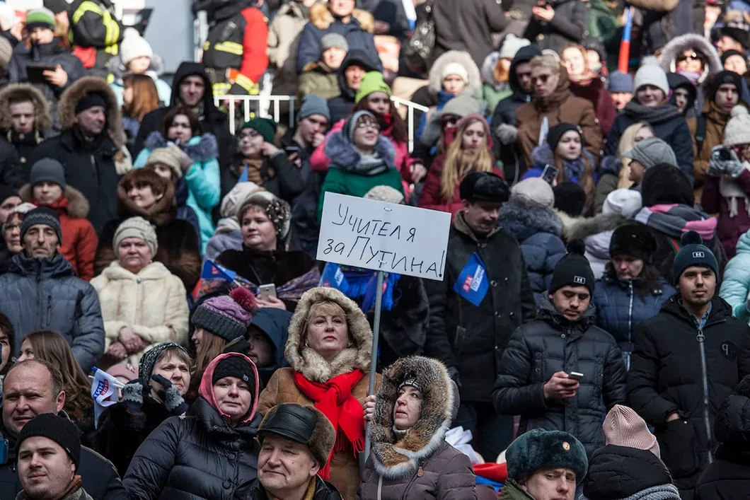 Погода была хорошая, не морозная, глаза слезились от солнца и не только. Всюду были флаги России и лозунг «Сильная страна — сильный президент».