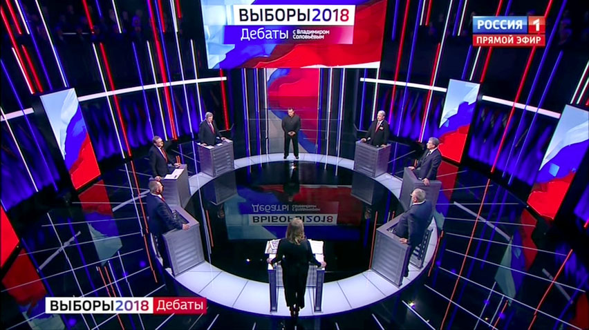 Во-вторых, важна среда, о чем уже отчасти сказано выше. Это Жириновскому в 1993 году позволяли просто садиться в кадр и кричать в камеру все, что он считал нужным. В 2018 году такие фокусы не проходят. Сейчас любой кандидат всегда находится в обществе нескольких коллег, минимум двое их которых (Жириновский и Сурайкин) считают своим долгом поднимать уровень шума в студии каждый раз, когда звучит что-то нелицеприятное для власти. В особо важные моменты свое бурчание добавляют Бабурин и даже Титов. Кроме того, кандидат находится не в каком-то уникальном пространстве «выступления кандидата в президенты», как это было когда-то. Фактически выступления кандидатов в президенты и выглядят, и проходят как обыкновенное политическое шоу на федеральных каналах: яркая студия, авторитарный ведущий, парочка «заряженных» фриков на фоне лоялистского большинства. Нет сомнений, что сделано это умышленно и с понятной целью: есть Путин, а есть персонажи телешоу, вот и выбирайте себе будущее.