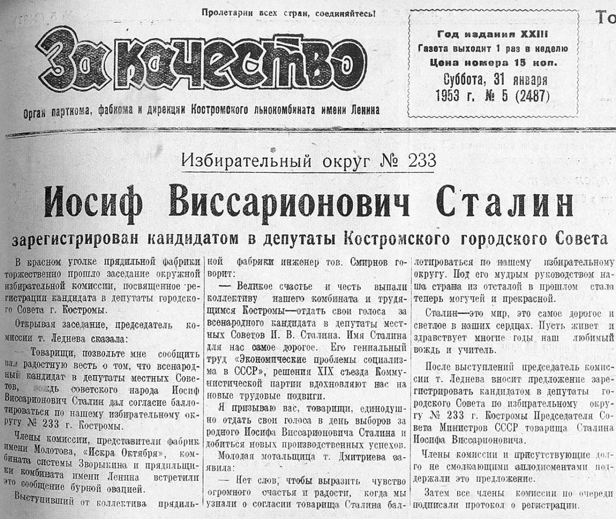 Номер льнокомбинатовской газеты «За качество» от 31 января 1953 годаФото: starina44.ru «Для нас, советских людей, для простых людей во всем мире нет человека ближе, роднее, любимее, чем наш товарищ Сталин. С огромной радостью воспринял каждый из нас известие о том, что Иосиф Виссарионович Сталин дал согласие баллотироваться в депутаты Костромского городского Совета и зарегистрирован кандидатом в депутаты. Хочется от всей души, от всего сердца сказать спасибо, дорогой товарищ Сталин! Мы оправдаем ваше доверие самоотверженной работой на благо Родины», — вторила старейшая работница комбината.