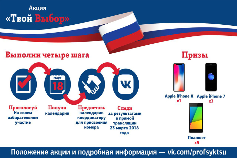 В начале марта в группе профкома студентов СыктГУ в социальной сети «ВКонтакте» разместили объявление о возможности выиграть iPhone X или iPhone 7 фирмы Apple либо один из пяти планшетов. Для этого студентам предлагалось сделать четыре шага: проголосовать, получить календарик на своем выборном участке, 18 марта предоставить календарик координатору акции в одном из общежитий университета или в главном корпусе, наблюдать за прямой трансляцией розыгрыша 23 марта.