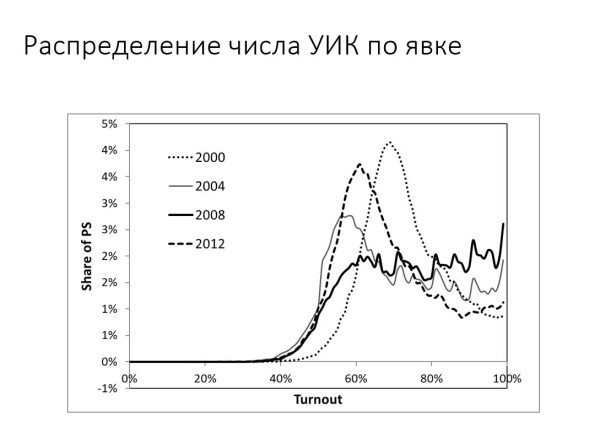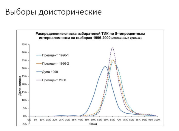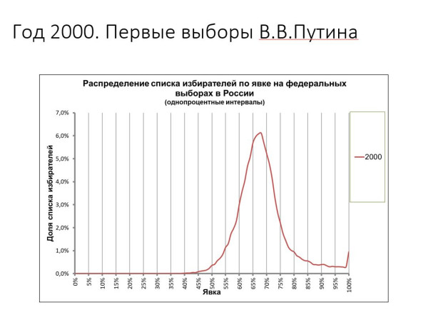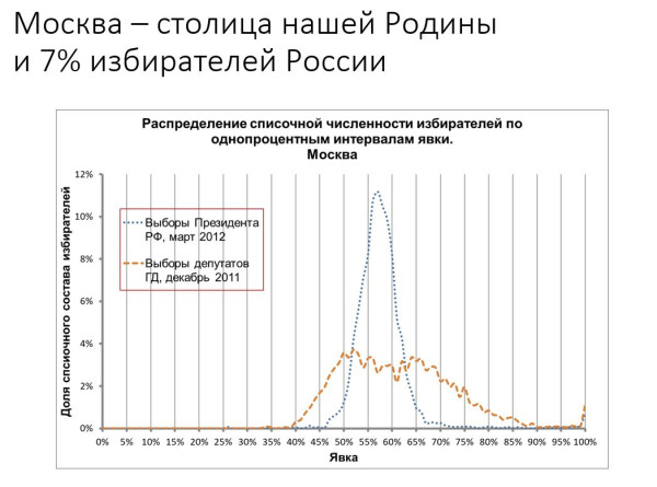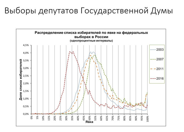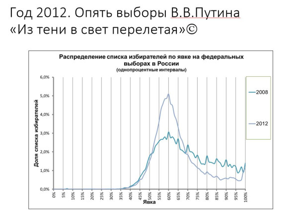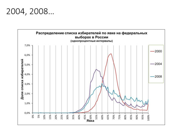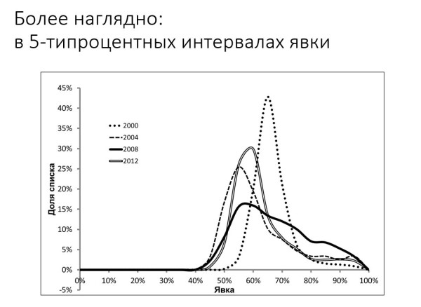 Дело в том, что, если явку считать честно, не приписывать и не завышать её в некоторых комиссиях, указанное распределение определяется довольно устойчивыми характеристиками общества: традициями, политическим контекстом, социально-экономическими обстоятельствами. Поэтому в этом распределении не должно быть больших скачков (если бы все избиратели проявляли бы одинаковое СЛУЧАЙНОЕ поведение относительно участия в голосовании, то это распределение было бы очень близко к так называемому «гауссовому» или «нормальному» распределению). Большие скачки в распределении означали бы, что какие-то диапазоны являются редкими, что было бы странно на едином информационном и политическом пространстве.