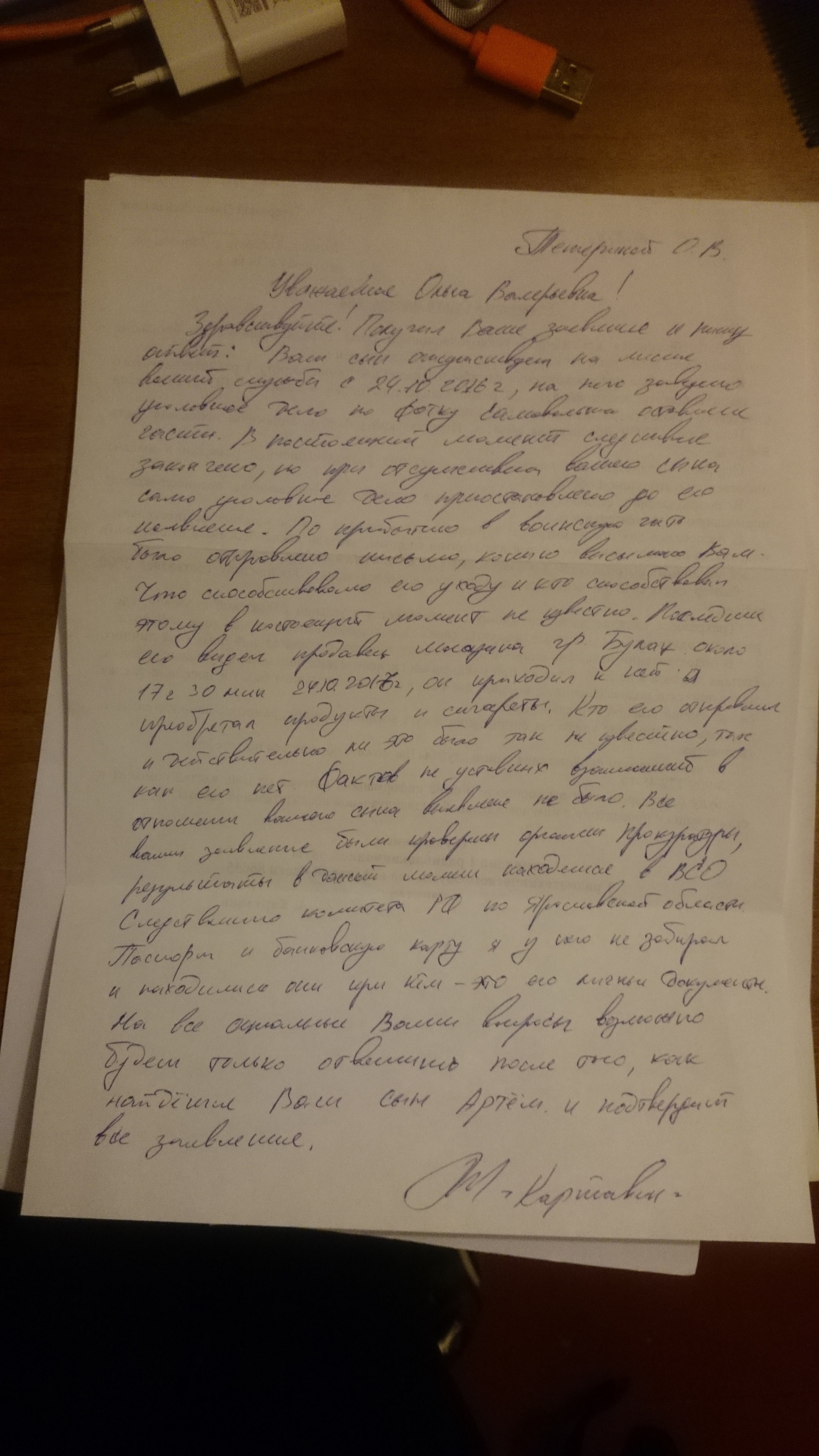 Из дома принялась забрасывать письмами и запросами военные ведомства. Получала лишь отписки. Одна из них – рукописное письмо командира части. В нем сообщалось, что "по факту самовольного оставления части на военнослужащего Артема Тетерина заведено уголовное дело. Что и кто способствовали его уходу – не известно. Последним его видел продавец магазина около 17 часов 30 минут 24 октября 2016 года, у которого Артем приобрел продукты и сигареты. Фактов неуставных отношений в отношении Артема не выявлено. По факту вашего заявления была проведена проверка органами прокуратуры, результаты переданы в Следственный комитет по Ярославской области. На все вопросы можно будет ответить после того, как Артем найдется".
