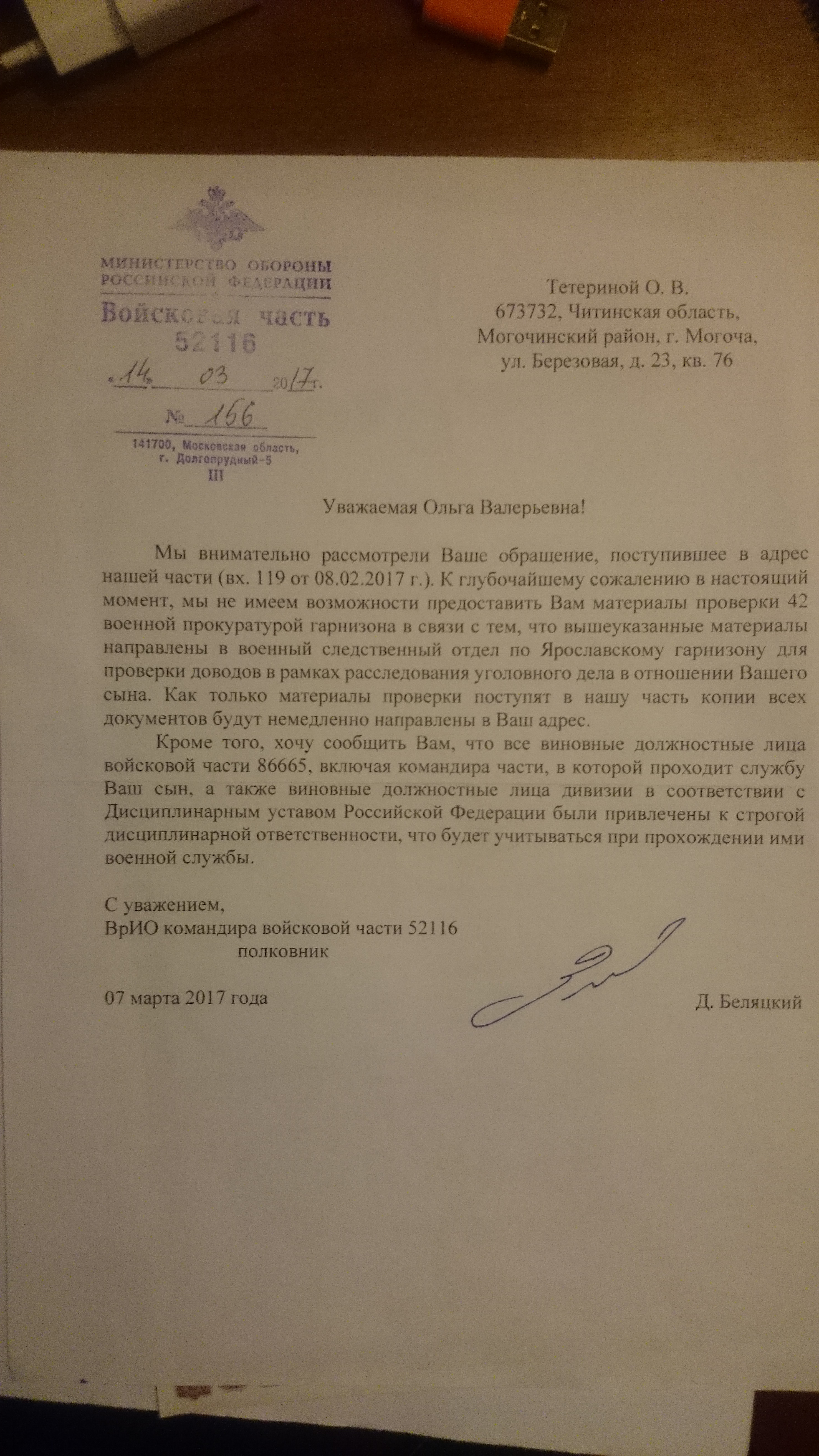 Ольга написала жалобу на проведение следствия. Но заместитель военного прокурора Ярославского гарнизона Павел Байбурин в удовлетворении жалобы отказал.
