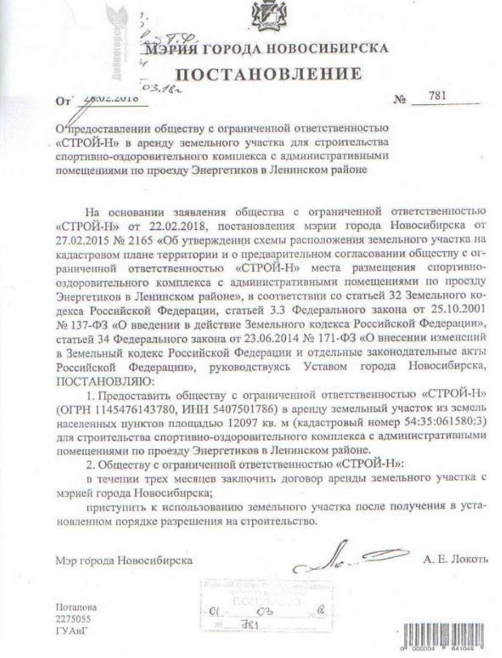 Мэр Новосибирска Анатолий Локоть подписал постановление о выделении строительной компании земельного участка, который ранее местные жители отстояли от застройки, выходя на митинги.
