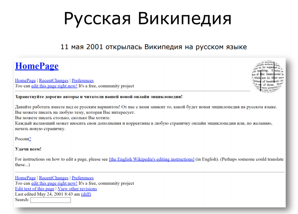 11 Мая 2001 года появилась русская Википедия, которую создал один из сооснователей проекта, философ Ларри Сэнгер.