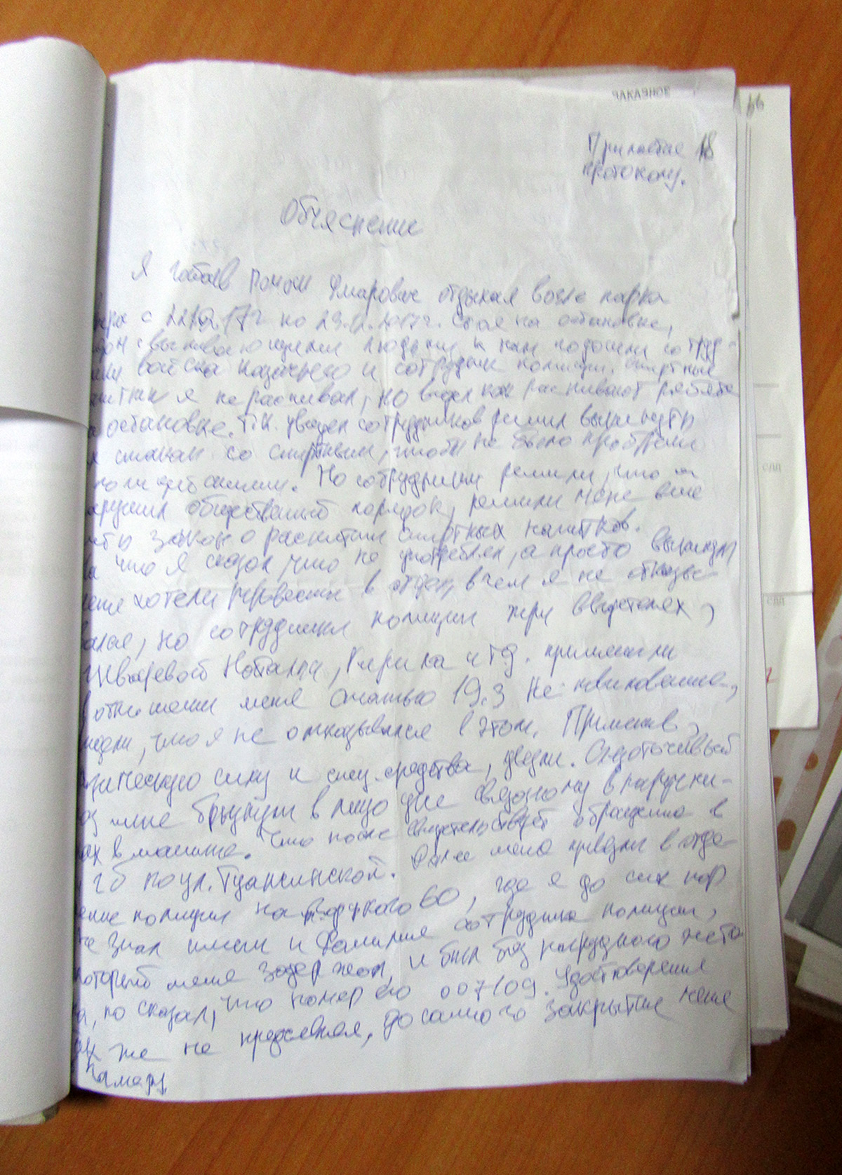 Когда к утру в отдел пришел начальник Александр Бондарев, задержанный продолжал требовать вписать его объяснения в протокол по статье 19.3 КоАП (неповиновение распоряжению полицейского).