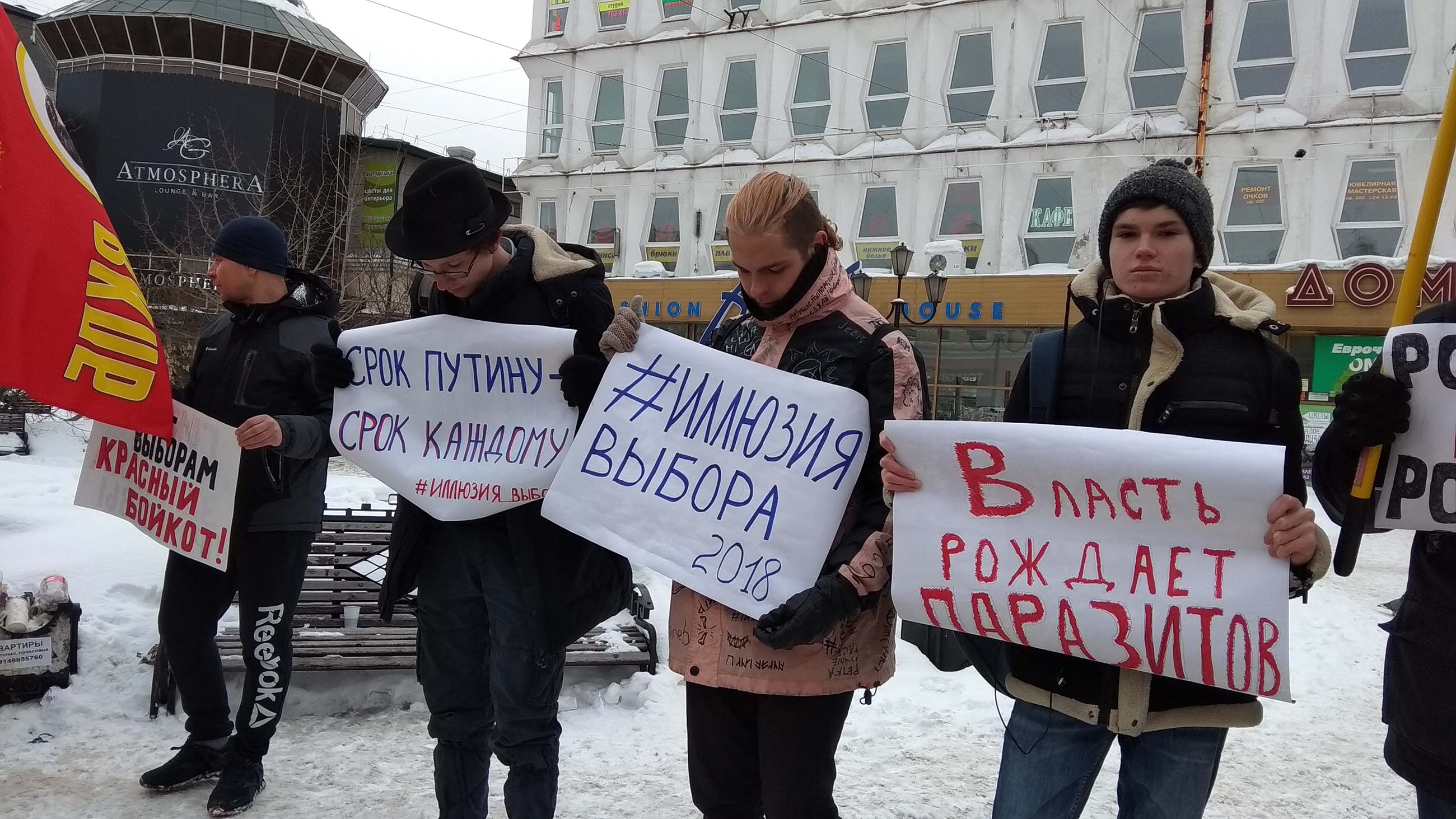 В центре Иркутска сегодня прошел митинг "За бойкот выборов президента России". Акцию протеста организовали активисты "Российского социалистического движения" и иркутские антифашисты. Их поддержали сторонники оппозиционера Алексея Навального. На протестное мероприятие собрались более сорока человек. Митингующие пришли с плакатами "Пойду на выборы, когда будет выбор", "Выборы без выбора", "Срок Путину – срок каждому".