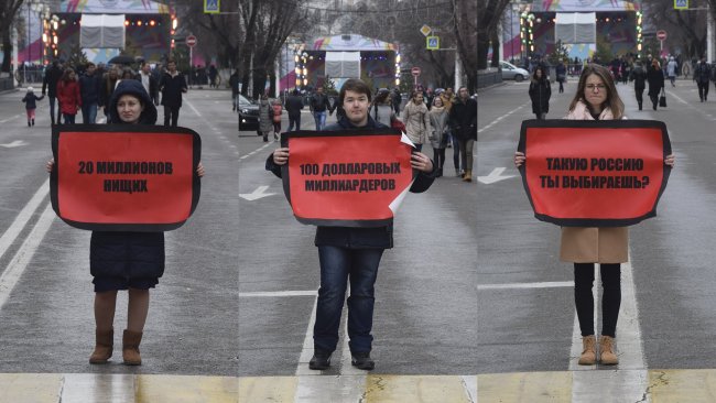 Активисты пикетировали с плакатами с надписями «20 миллионов нищих», «100 долларовых миллиардеров», «Такую Россию ты выбираешь?».