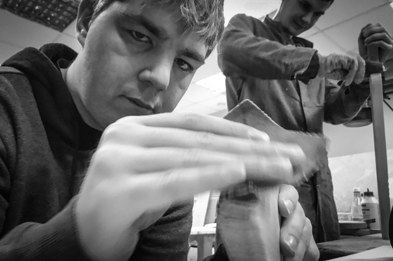 Иногда это помогает, и Дима делает несколько движений шкуркой. Ужасно хочется схватить этот лист, отшлифовать уже за него, и пусть сидит дальше. Но в мастерской никто так не сделает.
