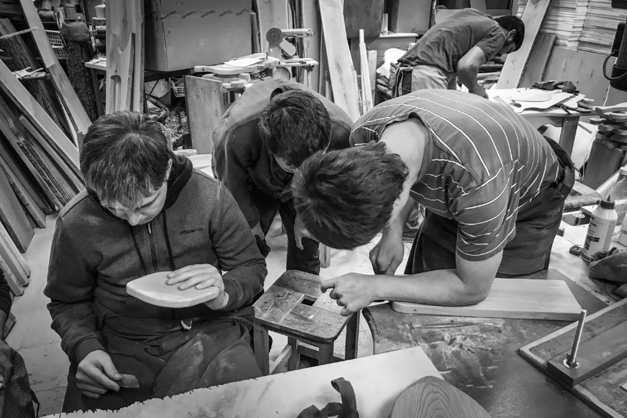 Дима (слева) во время работы в артелиФото: Павел Волков для ТД Мама и отчим умеют ходить на работу, Дима умеет быть один, пылесосить, убирать за котом, решать простые примеры на сложение и вычитание. Дима учится как следует шкурить детали, приносит из «Мастерской» тетради, где записан его заработок, количество отшлифованных заготовок.