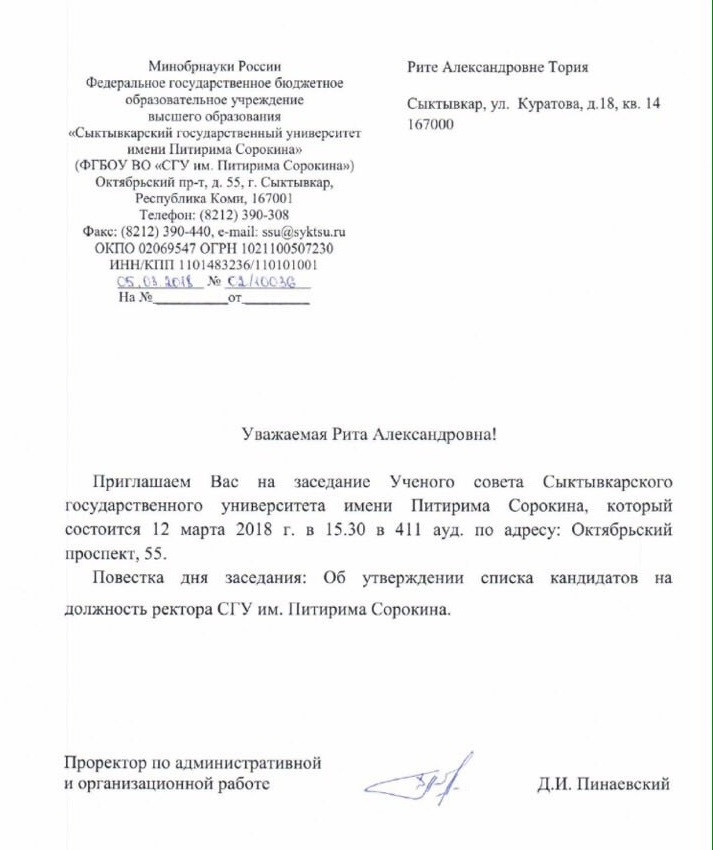 Ученый совет СыктГУ 12 марта на внеочередном ученом совете намеревался утвердить список кандидатов на пост ректора вуза. Об этом «7x7» рассказала бывший декан юридического факультета университета Рита Тория, которой пришло приглашение на заседание.