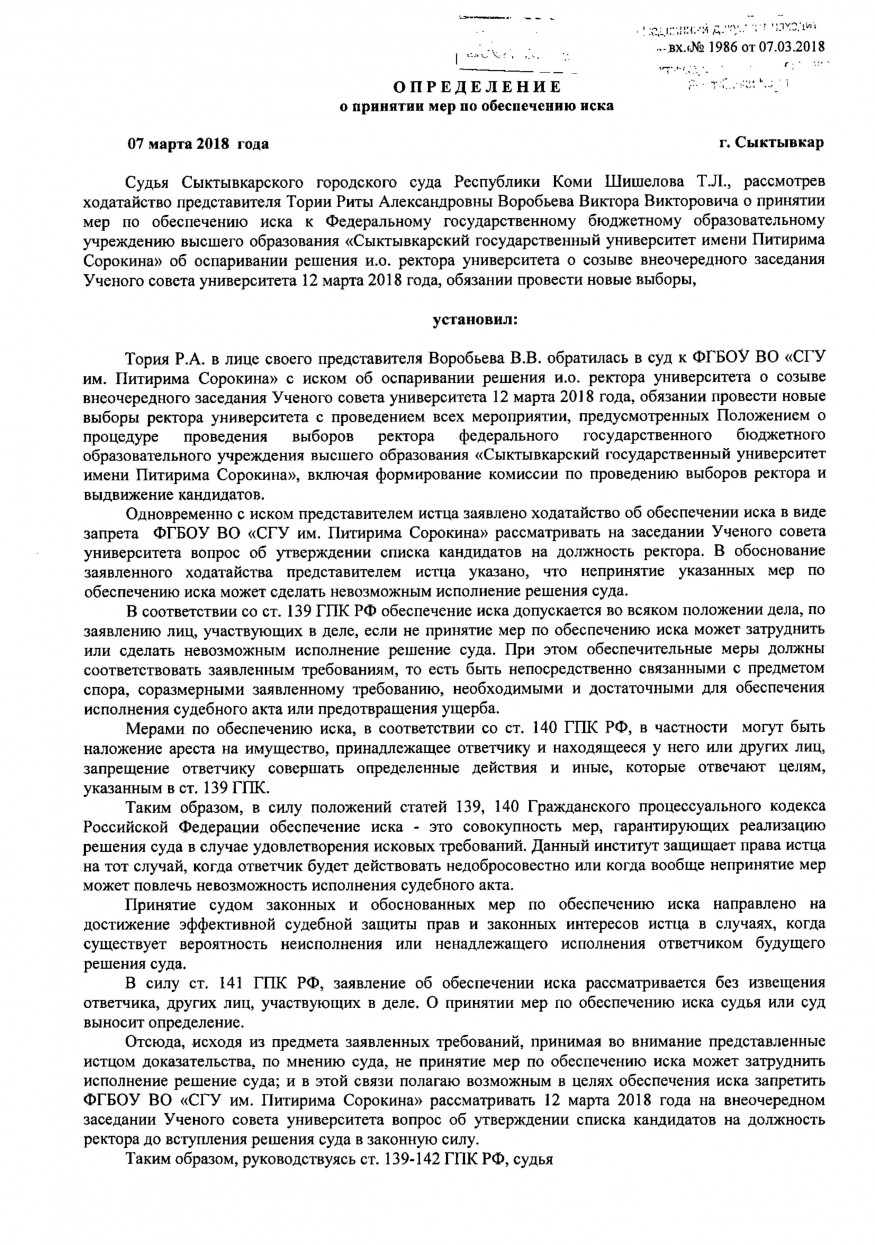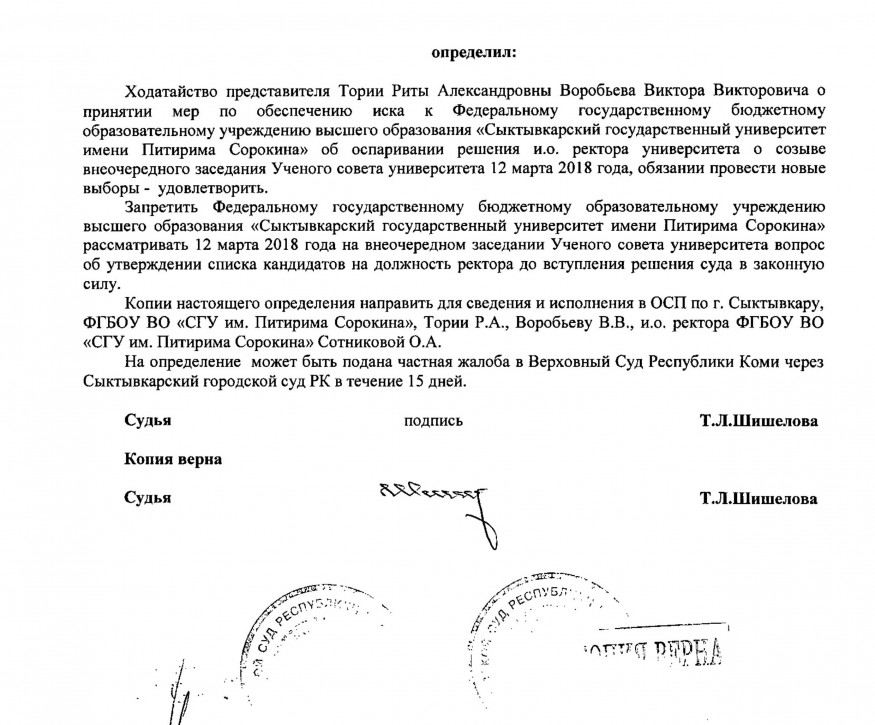 Когда Тория получила приглашение на ученый совет 12 марта, где ожидалось утверждение нового списка, то подала новое заявление в суд. Она посчитала, что таким образом положение о выборах ректора будет нарушено снова. Суд принял обеспечительные меры по ее иску и запретил вузу выносить такой вопрос на ученый совет.