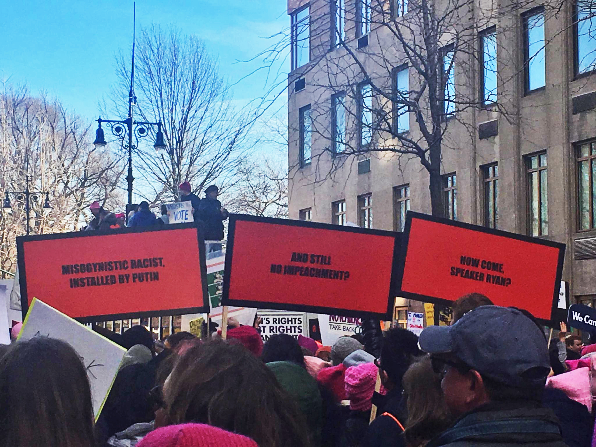 Россия и Путин несколько раз становились героями "трех билбордов" не только внутри страны, но и за рубежом. 20 января, в годовщину инаугурации Дональда Трампа сотни тысяч человек вышли в США на "Марши женщин", основными темами которых, как и год назад, стали права женщин и критика политики американского президента. Фотография, которую вы видите выше, была сделана американским актером и сценаристом Ником Паппасом на "Марше женщин" в Нью-Йорке. Надписи на плакатах, адресованных спикеру Палаты представителей Конгресса США Полу Райану, гласят: "Мизогонистический расист, поставленный Путиным", "И по-прежнему нет импичмента?", "Как же так, спикер Райан?".