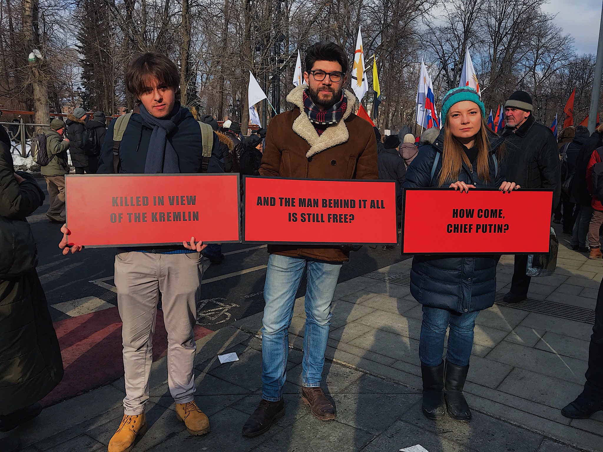 25 февраля, накануне третьей годовщины убийства российского оппозиционного политика Бориса Немцова, в Москве и других российских городах состоялись акции его памяти. В московском марше памяти Немцова участвовали тысячи человек. В том числе компания молодых москвичей, решивших повторить идею из фильма: они вышли на марш с плакатами в стилистике "трех билбордов", на которых были такие надписи: "Killed in view of the Kremlin", "And the man behind it all is still free?", "How come, chief Putin?" ("Убит напротив Кремля", "И человек, который стоит за этим, все еще на свободе?", "Как же так, шеф Путин?").