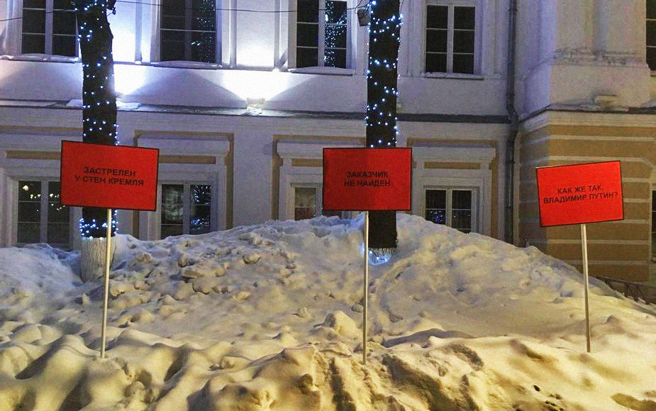 Организаторы акции, попросившие не называть их имен: "Еще когда мы смотрели эту потрясающую и вдохновляющую картину, пришла мысль воплотить в жизнь задумку из кино. Хотелось показать, что мы знаем и помним, кто виновен в том, что убийство Немцова не раскрыто". "После просмотра фильма мы подумали о том, что было бы с этой ситуацией в России. Поняли, что настоящие билборды точно никто не согласует, нет таких смелых бизнесменов. Зато есть плакаты. Изначально мы предполагали, что нужно быть готовым к задержанию, и решили обойтись без пикетов. А уличное шествие нам не согласовали. Думали о том, где воткнуть плакаты – у дома Немцова или у его места работы. Все же решили, что лучше у Думы, хотя возможно, что у дома они бы простояли дольше. Убийство Немцова – это, пожалуй, самое громкое политическое убийство в России за последнее время. У нас в стране, как и в том фильме, все знают о нем, но кому-то постоянно мешают напоминания о незавершенности процесса".