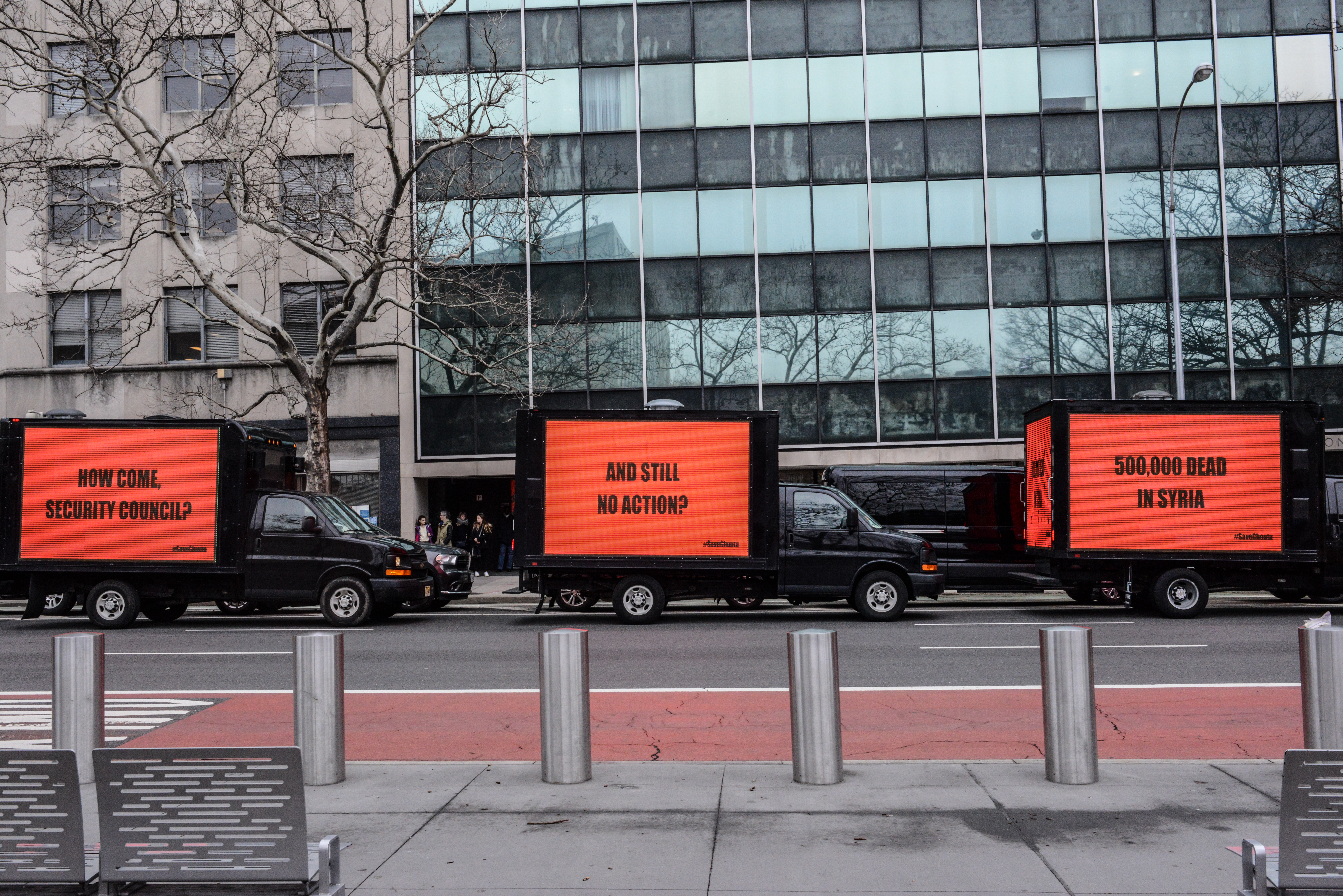 Надписи на билбордах переводятся так: "500 тысяч погибших в Сирии", "И по-прежнему никаких действий?", "Как же так, Совет Безопасности?". Россия заблокировала принятие резолюции, потребовав внести в нее поправки, в том числе исключить из перемирия ряд сирийских вооруженных группировок. В результате резолюция была принята 24 февраля, однако бомбардировки Восточной Гуты после нее не прекратились.