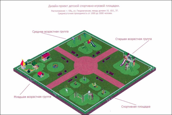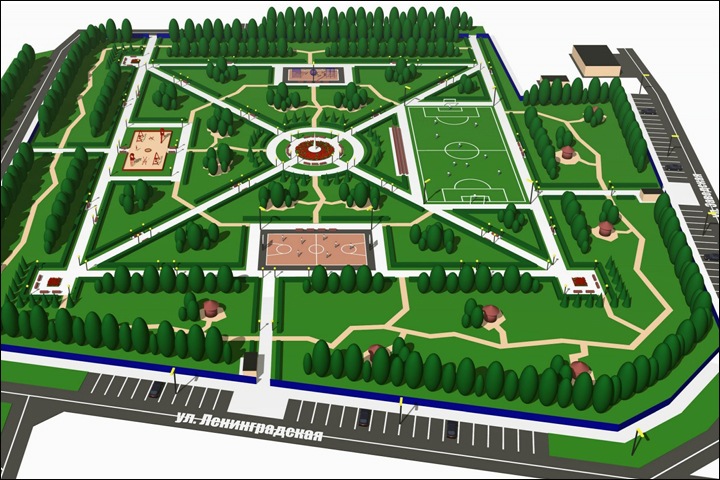 В Карасуке подошли к проектам обстоятельнее. В один парк на улицах Заводская и Ленинградская умудрились вместить футбольное поле, баскетбольную, детскую и спортивную площадку. Всё это по периметру обсажено деревьями. Все дорожки сходятся в центре территории, где по кругу поставлены лавочки — жители смогут сидеть и смотреть в центр композиции, где поставят безымянный продолговатый конус.