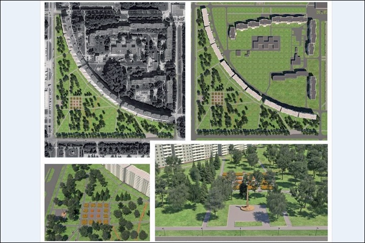 Судя по эскизам, предлагается сделать упор на крупные газоны с хаотичным вкраплением деревьев. Последние почему-то подстрижены в виде многогранников, напоминающие ульи очень уж правильных пчел.