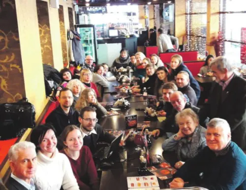 В кафе после экскурсии во время общего обеда мне удалось недолго поговорить с Юрием Алексеевичем о его исследованиях. Он знает и читает ТрВ-Наука, потому что в прошлом году на процесс приезжала наш корреспондент Наталия Демина.