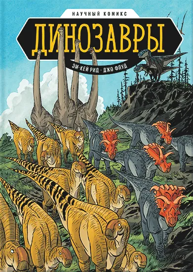 А теперь хотелось бы поговорить подробнее о недавно переведенной книге «Динозавры. Научный комикс» (Dinosaurs: Fossils and Feathers). Авторы — Джо Флуд (он рисует комиксы и иллюстрации для книг и журналов) и Эм-Кей Рид (у нее уже вышло нескольких взрослых и детских книг; кроме того, она рисует веб-комиксы по ирландским мифам). Книга была номинирована на премию Айснера (Eisner Awards), одну из самых престижных наград за лучший комикс года.