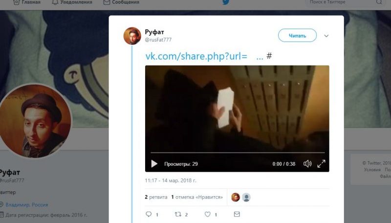 В Твиттере было опубликовано видео, снятое сотрудником полиции Комлевым, при задержании Кирилла Николенко, который распространял листовки. По нашей информации, этот аккаунт принадлежит сотруднику ФСБ, или специально посаженному ими за компьютер человеку, для вброса информации, вредящей владимирской оппозиции.