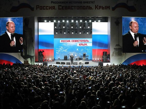 Обратившись к присутствующим, президент РФ поблагодарил их за то, что четыре года назад они проголосовали на референдуме за воссоединение с Россией, приняли «историческое решение» и тем самым восстановили нарушенную при СССР историческую справедливость. «Благодаря вашему решению Севастополь и Крым вернулись в свой родной дом нашей общей родины, дом нашей матушки России», — заявил Путин.
