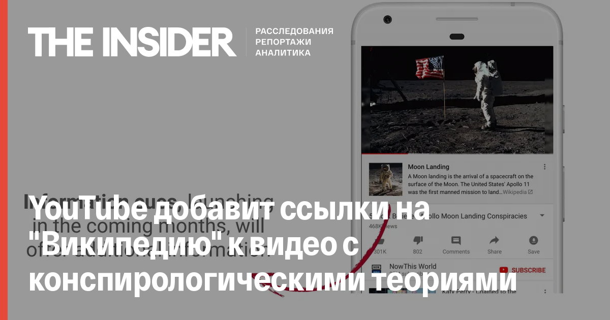 Видеохостинг YouTube добавит к роликам с различными теориями заговора ссылки на «Википедию» и другие сайты с достоверными данными об описываемых событиях. Об этом заявила глава YouTube Сьюзен Войжитски на фестивале South by Southwest в Остине.