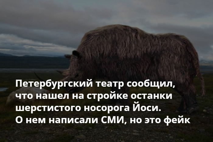 12 марта петербургские и федеральные СМИ сообщили, что на Васильевском острове приостановлено строительство здания для проекта «Театр. На вынос». Стройка якобы встала из-за того, что строители раскопали останки детеныша шерстистого носорога.