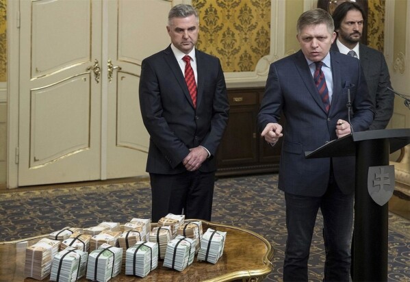 Роберт Фицо с миллионом евро, объявленным в награду за информацию об убийстве журналиста. Фото AP