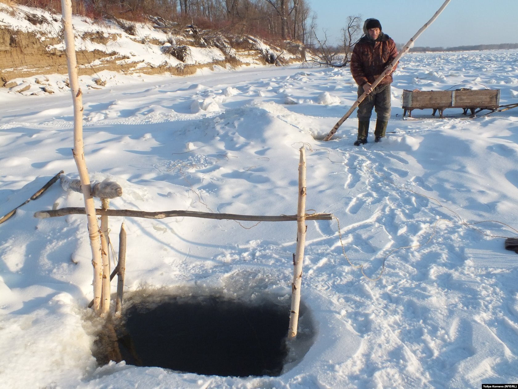 Ближе к другому берегу Сычины начинают проверять сети. Две лунки в 15 метрах друг от друга. Сеть протягивают длинной жердью. Потом раз в день ее нужно проверять.