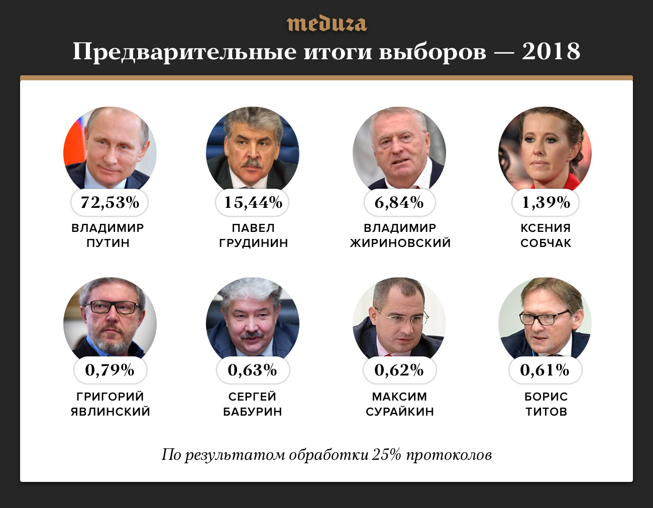 Дата18.03.2018АвторСкрытИсточникМедузаСохранённая копияInternet ArchiveOriginal MaterialShow translationИтоги президентских выборов после обработки четверти бюллетеней. В одной картинкеkremlin.ru (3); A. Savin / Wikimedia; Kodru / Wikimedia; Юрий Кадобнов / AFP / Scanpix / LETA Данные ЦИК. За подсчетом голосов можно следить здесь. Фото в анонсе: Антон Ваганов / Reuters / Scanpix / LETA