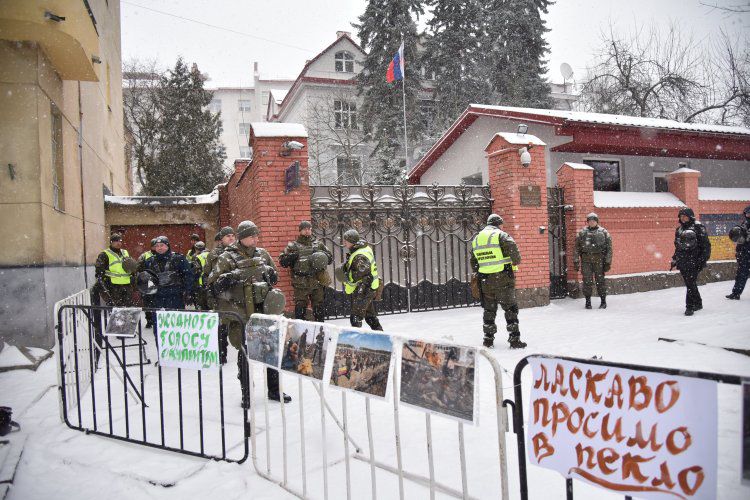 В середине дня у здания посольства в Киеве митинговало более 50 представителей разных украинских националистических групп, включая признанный в России экстремистским и запрещенный «Правый сектор». Они грелись у бочек, внутри которых горели дрова, пили чай. Некоторые брали рупор и время от времени произносили речи.