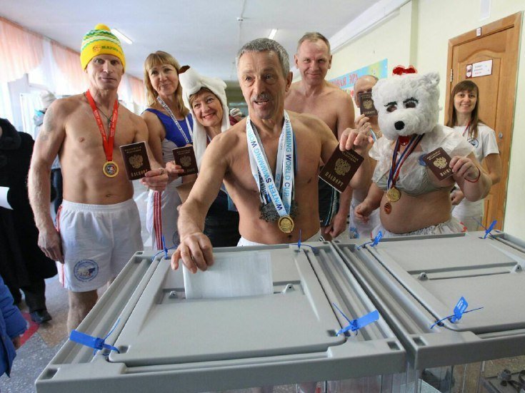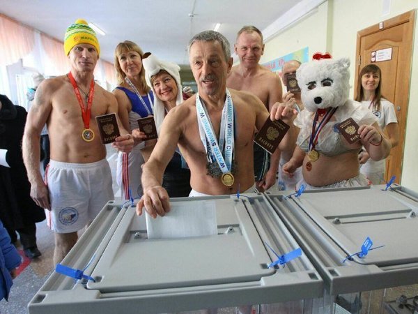 Целое шоу из голосования устроили члены клуба зимнего плавания «Белые медведи» в Алтайском крае. После того, как «моржи» сделали свой выбор, они исполнили несколько акробатических трюков перед зданием школы, где расположен участок, а затем совершили «президентский» заплыв на озере Пионерском.