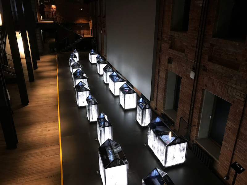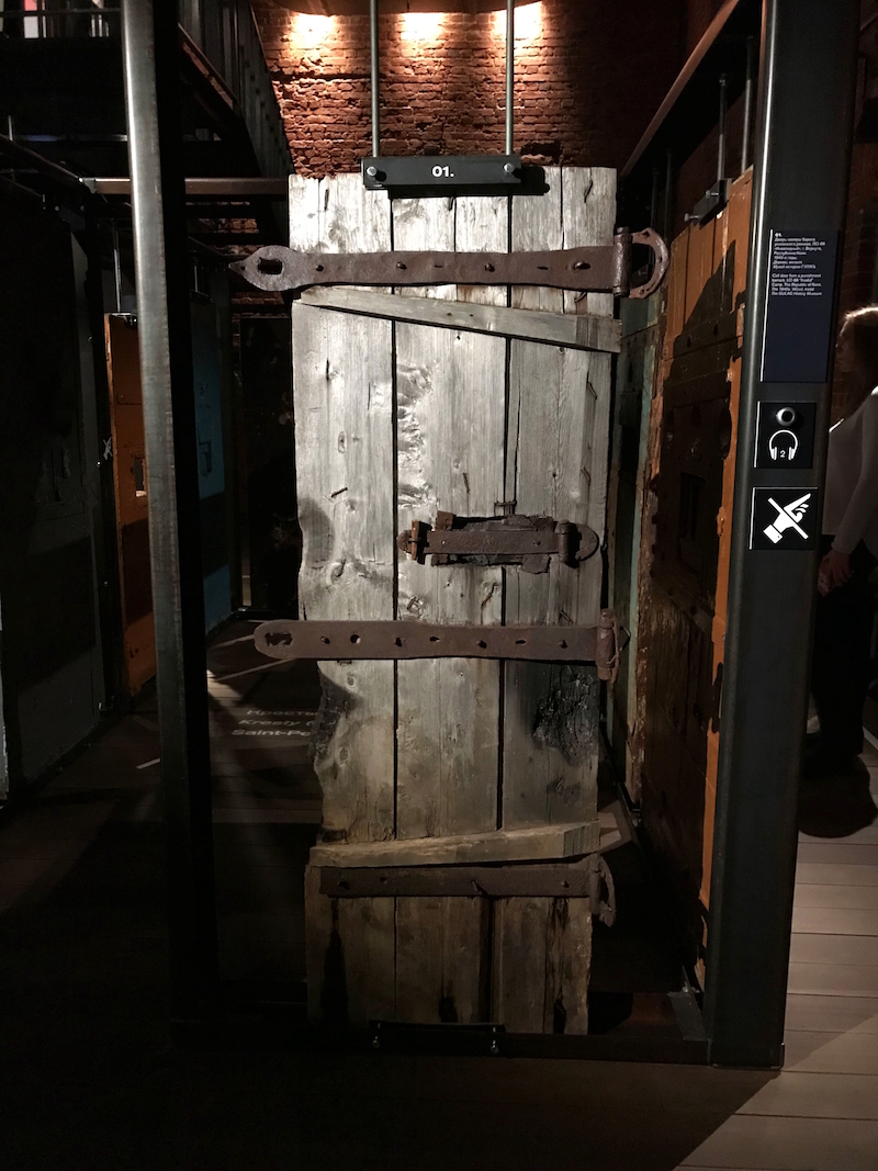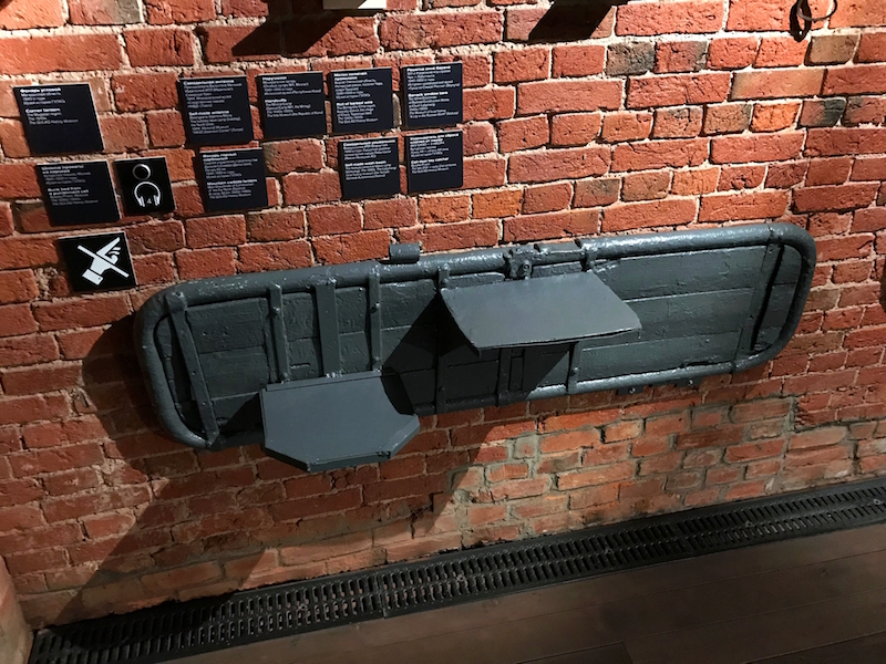 Вежливые музейные охранники в черных костюмах доброжелательно, как сотрудники погребального бюро, показывают в направлении кассы. Камеры хранения под рюкзаки сделаны из стали, увесистыми дверцами напоминая сейфы, черный номерок гардероба холодит руку. От входа чувствуется, что проект музея разработан на высоком профессиональном уровне — единый стиль, заданный буквально несколькими деталями... Интерьер — кирпич, металл, дерево. Все как в бараке. Немного общих слов: