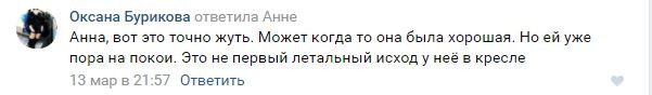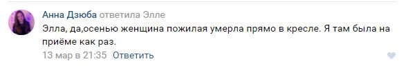 6 марта (на днях) умерла ещё одна пациентка этого доктора. На этот раз не в кресле, правда, а дома, после того, как доктор провела какие-то манипуляции с зубом и... направила пациентку в платную клинику. Предварительный диагноз — менингит. Загадочно...