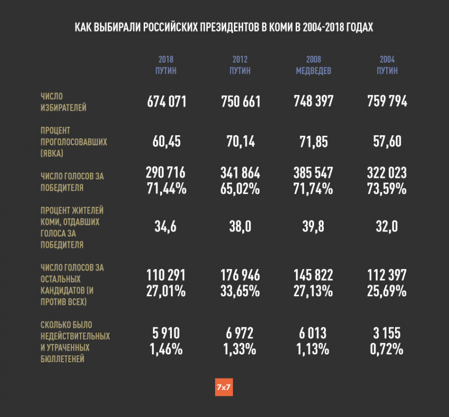 Владимир Путин 18 марта 2018 года получил голоса 290 тысяч жителей Коми (это немногим более трети от всего населения республики). Несмотря на высокий процент поддержки — 71,44 — это не лучший его результат: в предыдущие выборы за него голосовали активнее. Отчасти это объясняется тем, что людей, а соответственно, и избирателей в Коми было больше. Интернет-журнал «7x7» сравнил региональные итоги последних четырех избирательных кампаний на пост президента страны.