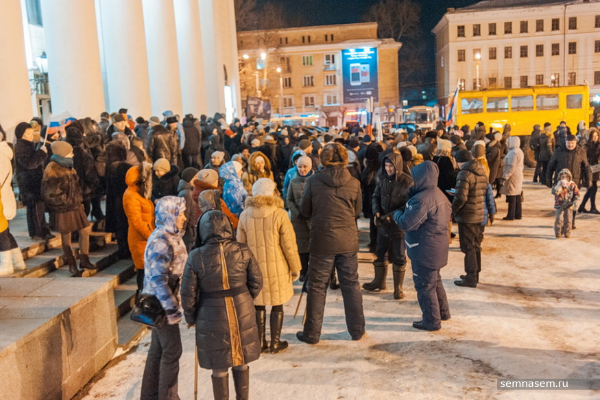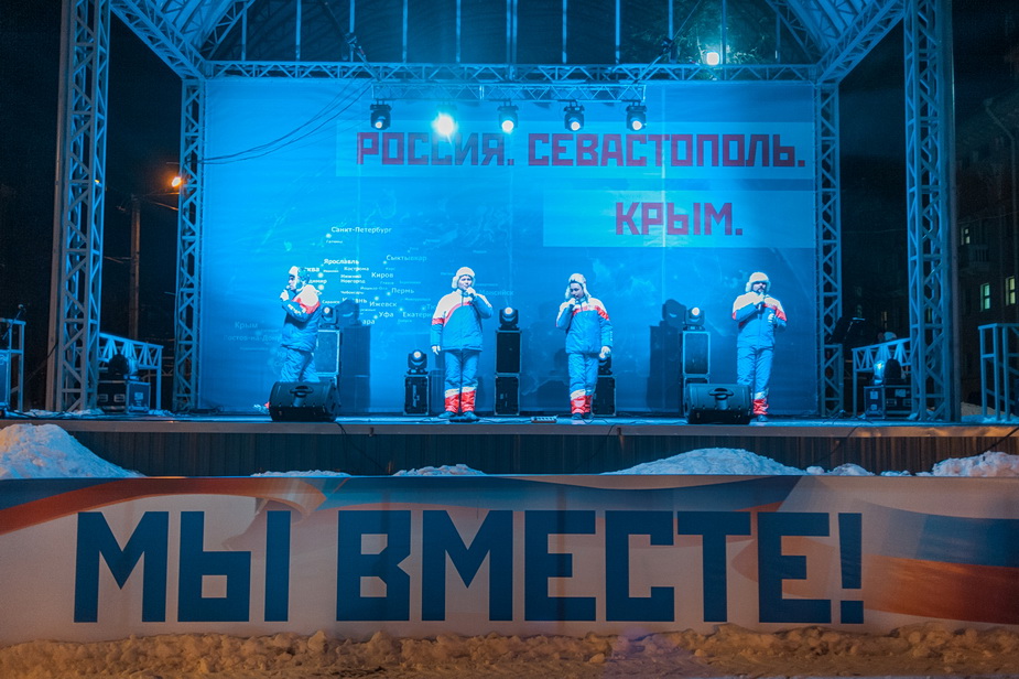 В Кирове 18 марта на Театральной площади за полчаса до закрытия избирательных участков состоялся праздник-концерт в честь четвертой годовщины присоединения Крыма «Мы вместе». Люди на него пришли организованно и целыми коллективами. Они этого не скрывали, хотя всячески подчеркивали — сделали это по предложению начальства, но добровольно. Корреспонденты «7x7» спросили участников праздника, почему они пришли на него вечером в воскресенье и почему так рады присоединению полуострова.