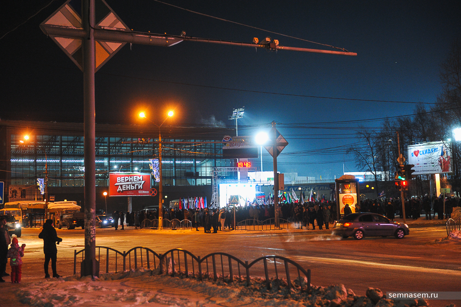 Первым на сцену поднялся председатель местного совета ветеранов Владимир Пыстин. Он поздравил сыктывкарцев и вспомнил о том, как советские войска вернули Крым в годы Великой отечественной войны. Затем сменивший его ведущий торжественно прочел стихи, в которых рассказывалось о том, как было плохо, когда распался Советский Союз. Стихотворение заканчивалось тем, что Крым вернулся к России и это хорошо. О возвращении говорил даже билборд слева от сцены, правда, там вернуть обещали деньги.