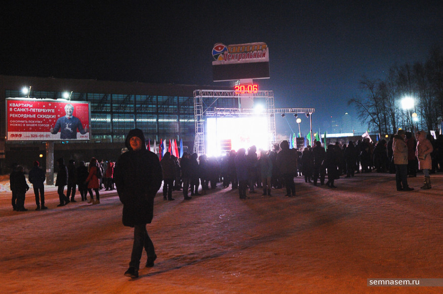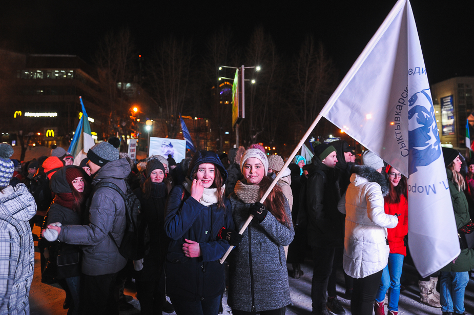 Перед сценой студенты Сыктывкарского лесного института (СЛИ), Сыктывкарского госуниверситета (СыктГУ) и медицинского колледжа размахивали флагами России и своих вузов. Ведущий представил одного из артистов театра оперы и балета Коми, который запел «Севастопольский вальс». Некоторые начали пританцовывать. Толпа перед площадкой была довольно разреженной, люди стояли небольшими группами, многие из них даже не смотрели на сцену и разговаривали друг с другом.