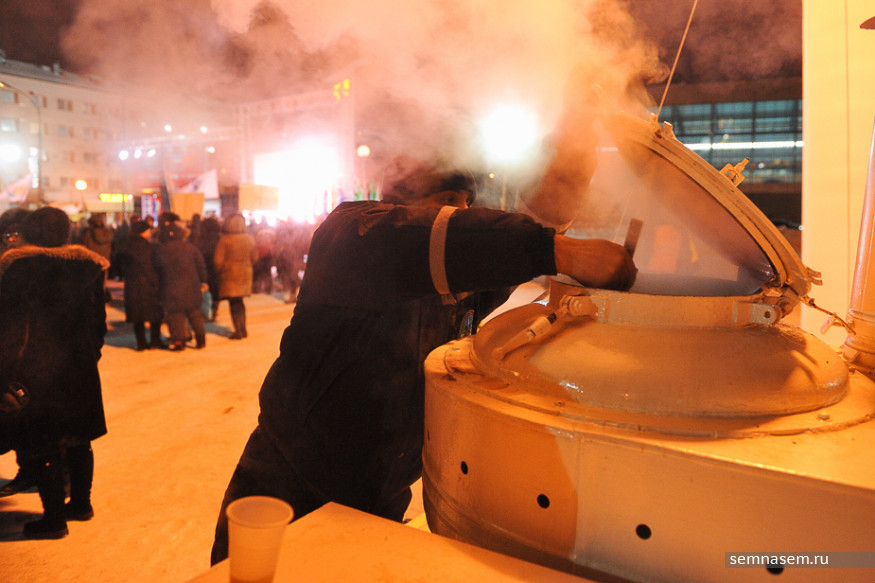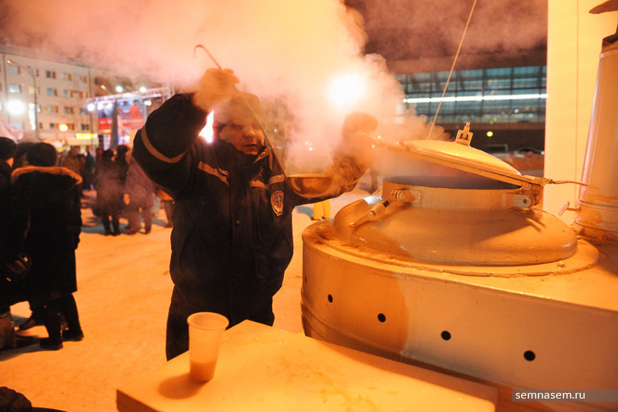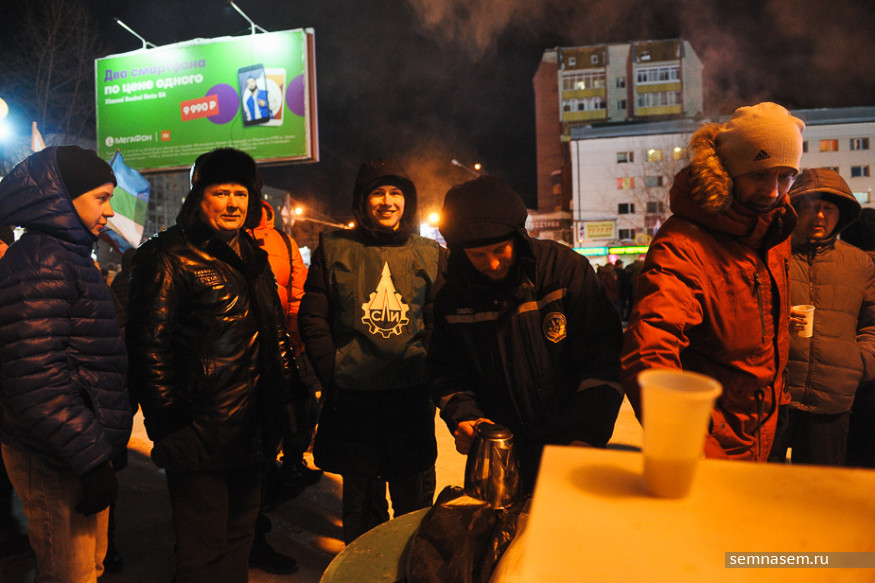 После заслуженного учителя одна из артисток должна была исполнить песню, но техника дала сбой, видимо, из-за мороза. Людям было проще — им выдавали бесплатный горячий чай.