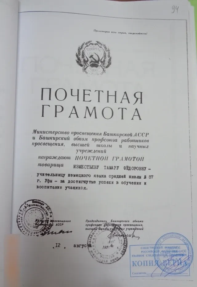 Помимо характеристики Тамара Изместьева предоставила следователю многочисленные почетные грамоты, в том числе: от Министерства просвещения Башкирской АССР за успешную работу по обучению и воспитанию учащихся от 1973 года; от Министерства просвещения Башкирской АССР за достигнутые успехи в обучении и воспитании учащихся от 1974 года; от Уфимского городского отдела народного образования за успехи в учебно-воспитательной работе в связи с Днем учителя от 1988 года. В общем, Тамара Изместьева — исключительно положительный герой, заслуженный учитель и отличник народного просвещения Республики Башкортостан.