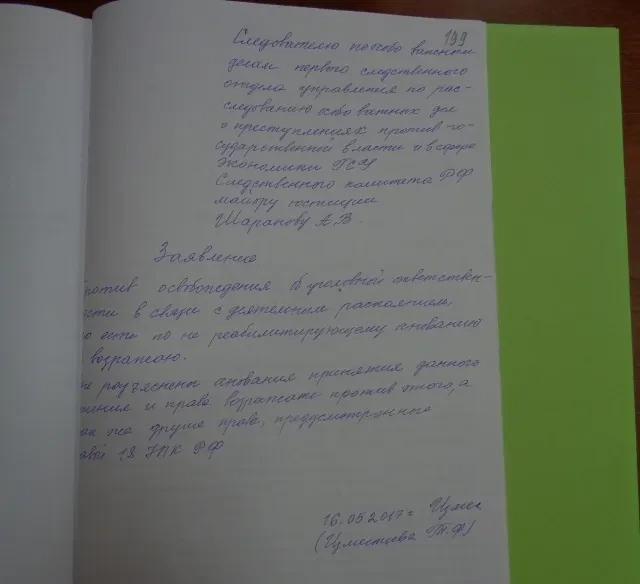 Через месяц следователь Шарапов прекращает уголовное дело против Изместьевой. Тамара Федоровна не возражает: «Против освобождения от уголовной ответственности в связи с деятельным раскаянием, то есть по не реабилитирующему основанию, не возражаю». И это притом, что на допросе у следователя Изместьева свою вину не признала.