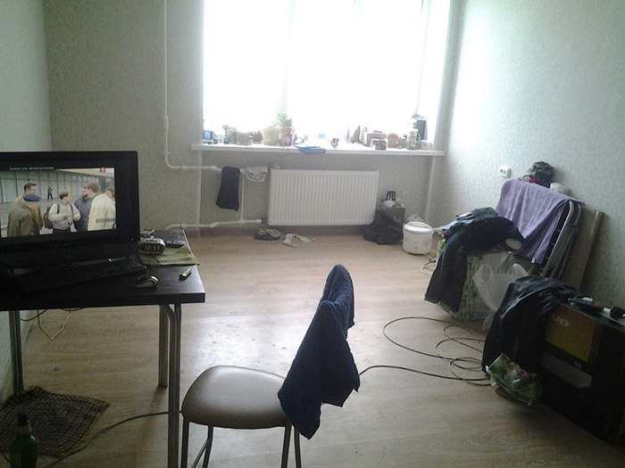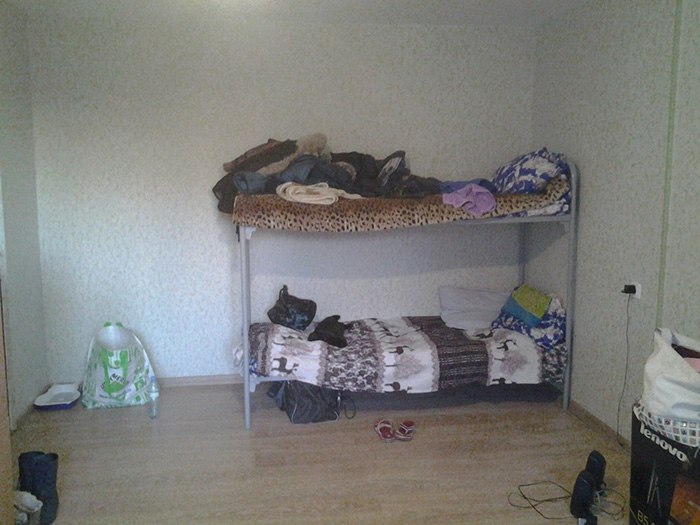 На следующий день нам принесли двухъярусную шконку, стол и тумбочку. Больше ничего. Но нам, можно сказать, повезло: мы общаемся с другими соседями, и видно, что у нас условия неплохие. Многих людей переселили в настоящие бомжатники.